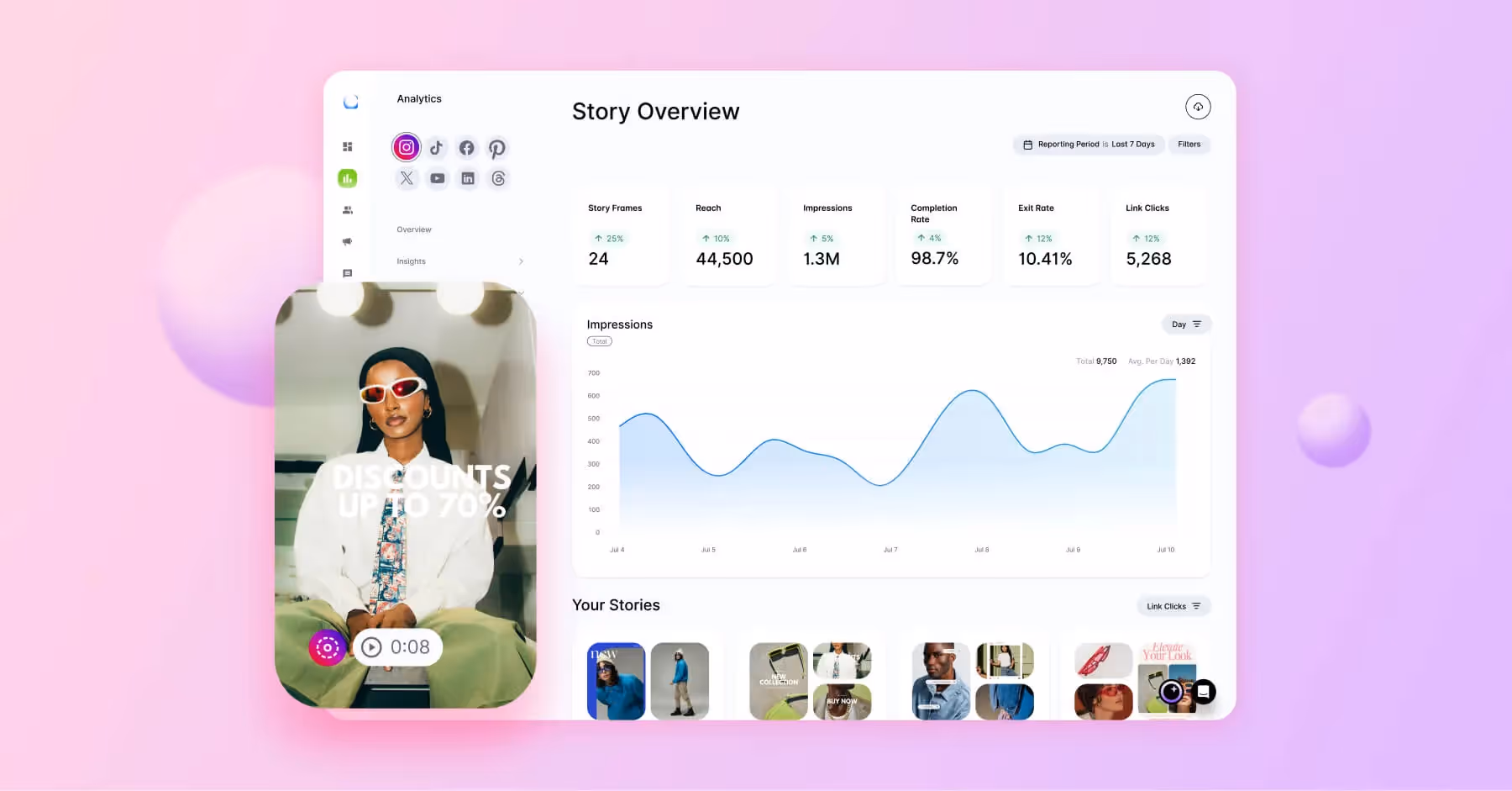 Dash Social is an excellent tool for optimizing Instagram Stories. The platform gives you all the Instagram Story Insights necessary for analyzing how your content is performing, such as identifying which content drives clicks and segmenting your content by type, campaign, or aesthetic to see what works best. In addition, Dash Social has also created Instagram Story performance benchmarks per industry, allowing brands to gain insight by comparing their KPIs to overall competitors in the same industry.