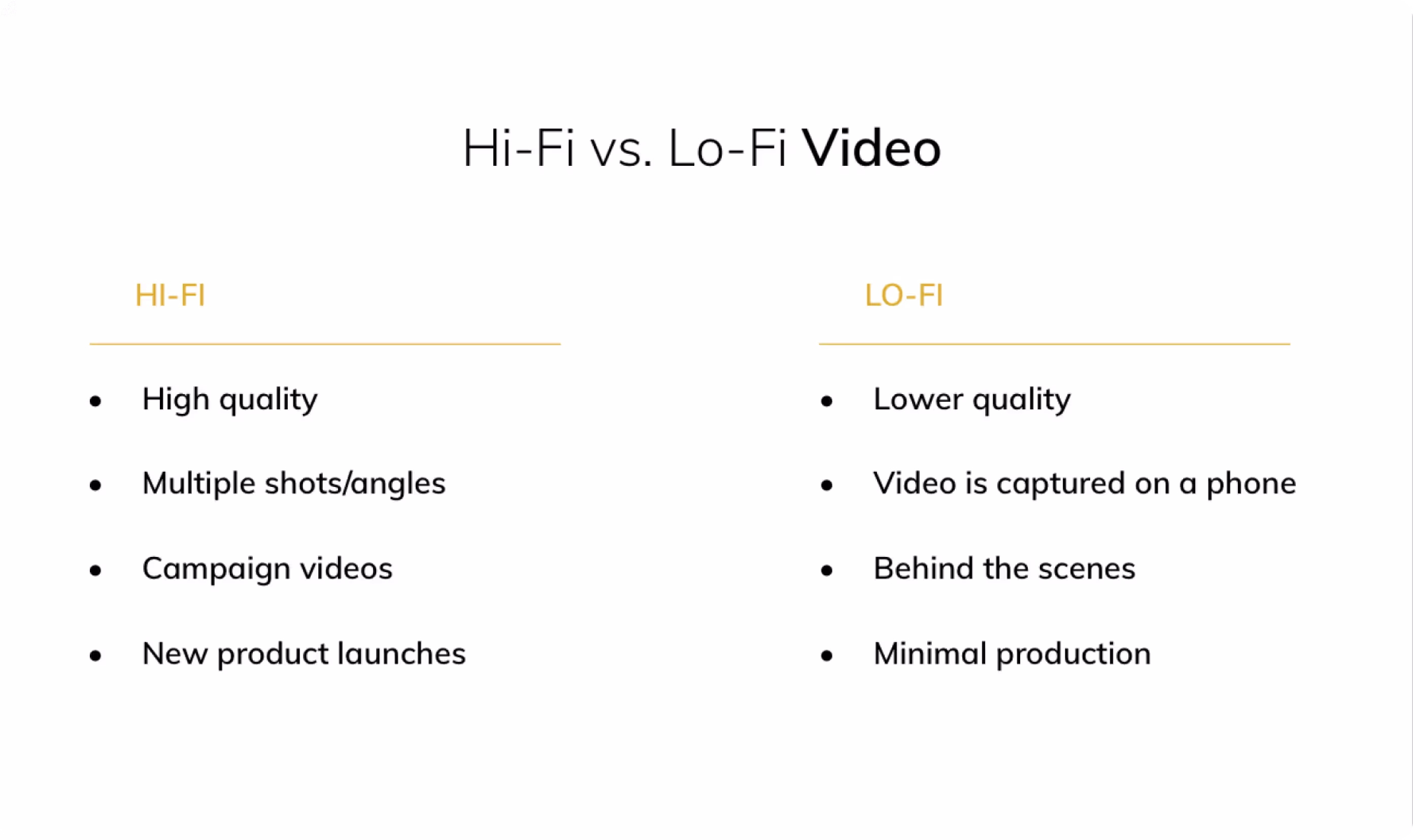 First things first, the term “lo-fi video” is frequently thrown around in the visual marketing sphere, but is rarely appropriately differentiated from hi-fi video. Lo-fi video refers to content that is captured on a mobile device. It’s lower quality, often behind the scenes or on the go, and requires minimal production. Meanwhile, hi-fi video is high-quality, professional-feeling video content that usually has an entire production crew behind it. This style of video is more often used for campaign videos that will be leveraged across marketing channels, or for new product launches.