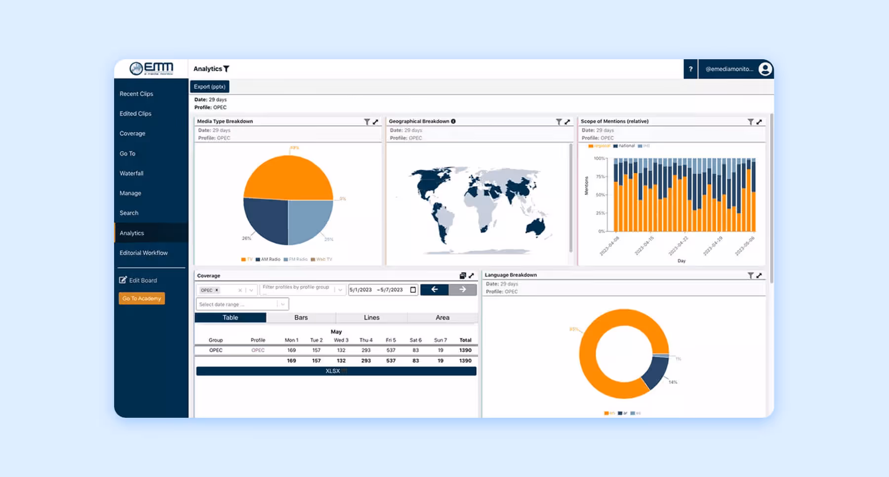 eMedia Monitor specializes in real-time broadcast monitoring across radio and TV. This makes it especially valuable for industries that rely on traditional media coverage. Compared with Meltwater, it offers stronger broadcast depth but does not match Meltwater’s breadth across PR, online, and social channels.