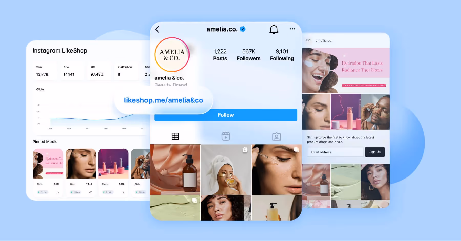 Brands have turned to link-in-bio tools like LikeShop to streamline the user experience — it’s a great workaround for Instagram’s linking limitations. Link-in-bio landing pages serve as a central space for relevant content to live, without having to sacrifice their profile link to just one landing page on their socials.