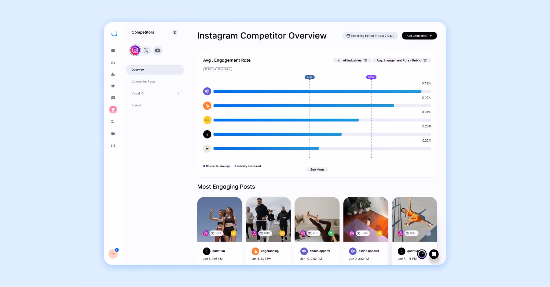 Remember those weekly and monthly reports we mentioned earlier? Dash Social lets you create custom Dashboards that pull in all the data you need and none of the data you don’t. Benchmarks are another asset to any social media report. Competitive Insights and Benchmarking let you compare your success and data to your competitors, so you can refine your goal and see how your brand stacks up in your industry.