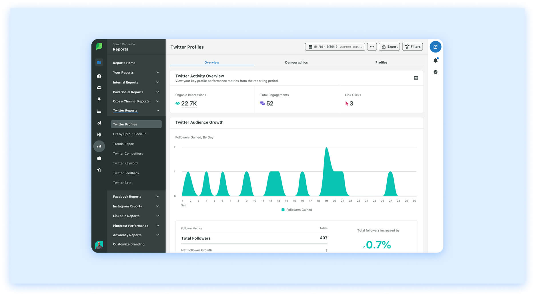 Sprout Social’s Twitter/X analytics take metrics a step further by providing keyword, hashtag, and demographic insights. Their analytics tools help break down which posts are more commercial or conversational, while their reports let you automate analytics for campaign success, hashtag performance, and surface insights related to popular sentiment and trends on X/Twitter.