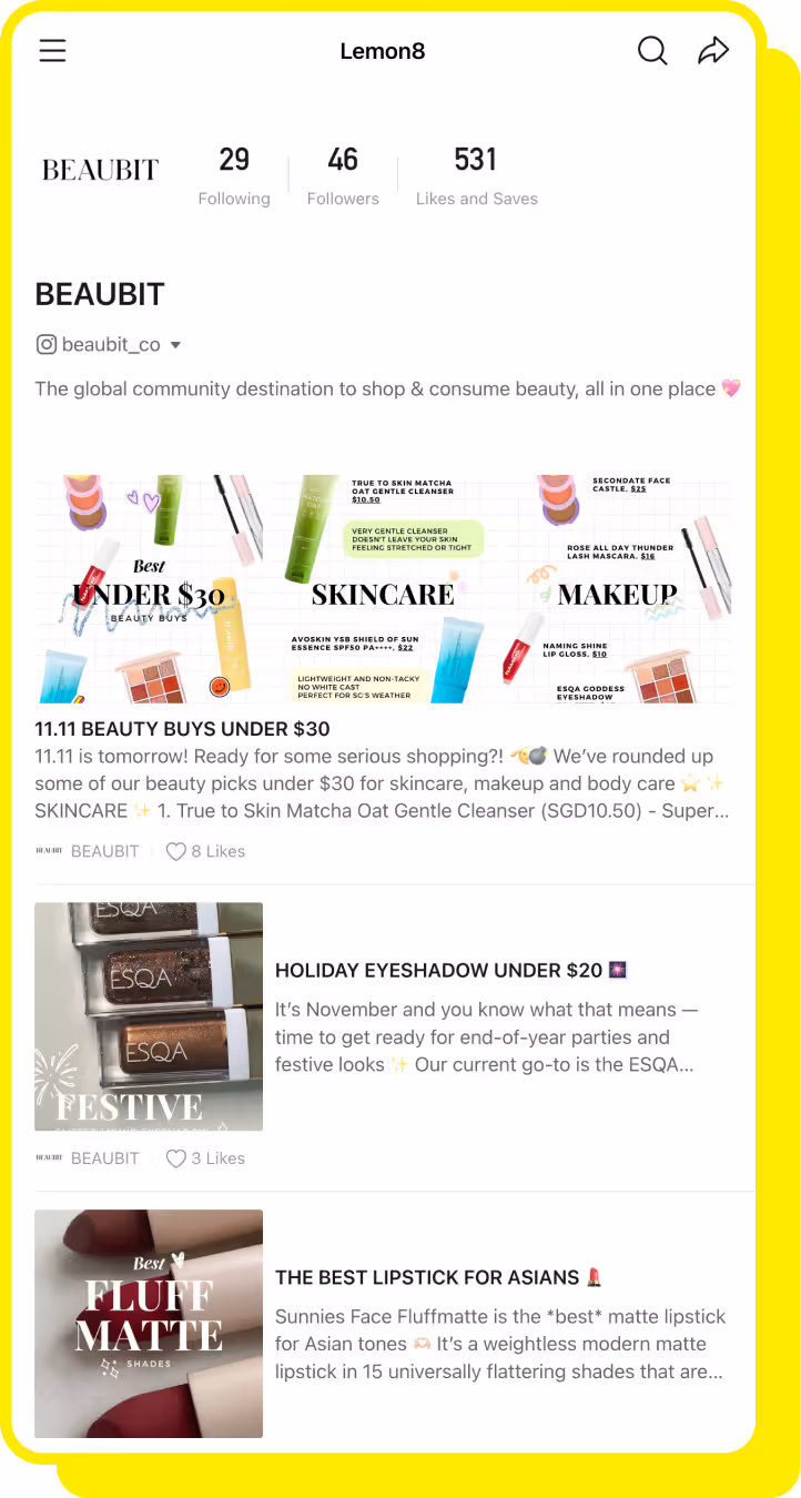 BEAUBIT refers to itself as "the global community destination to shop & consume beauty, all in one place”, and their Lemon8 account reflects that. They use the app to promote upcoming sales, share new products, and give step-by-step tutorials — even listicles featuring the best products.